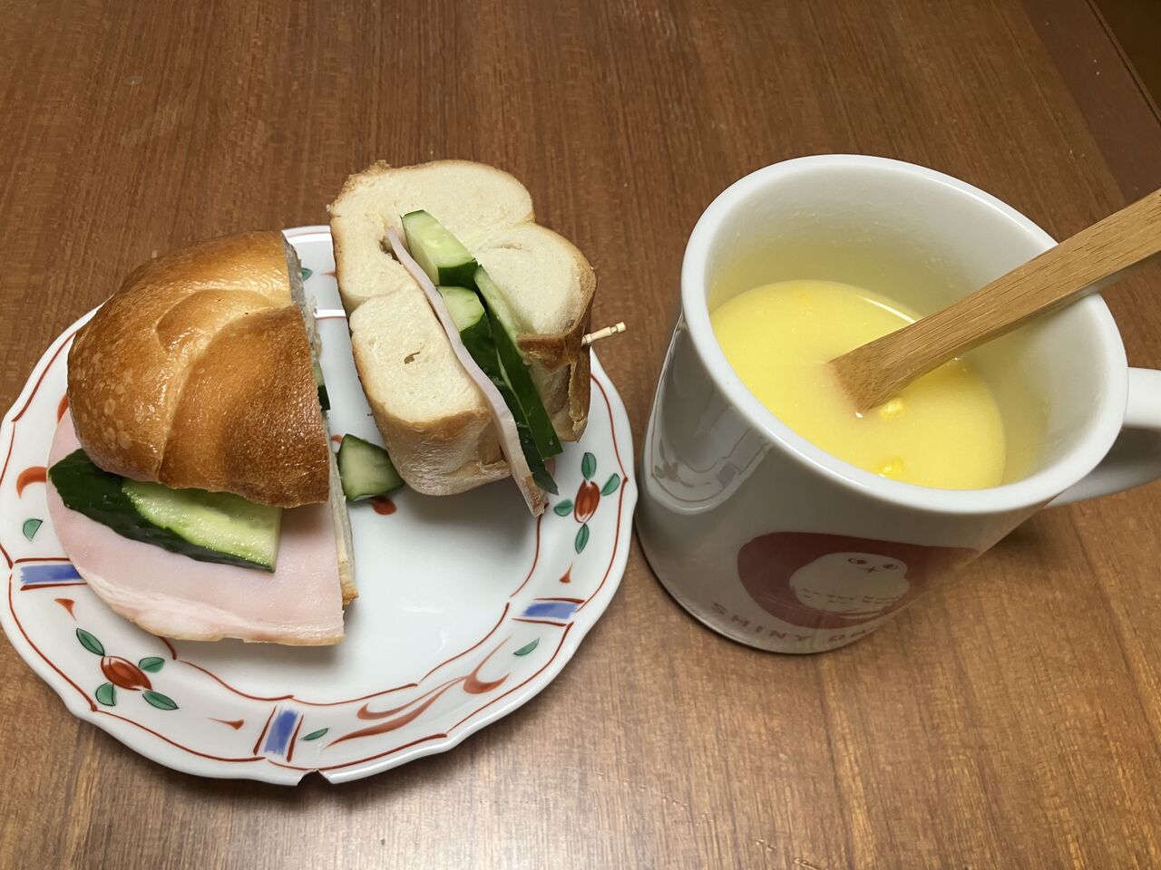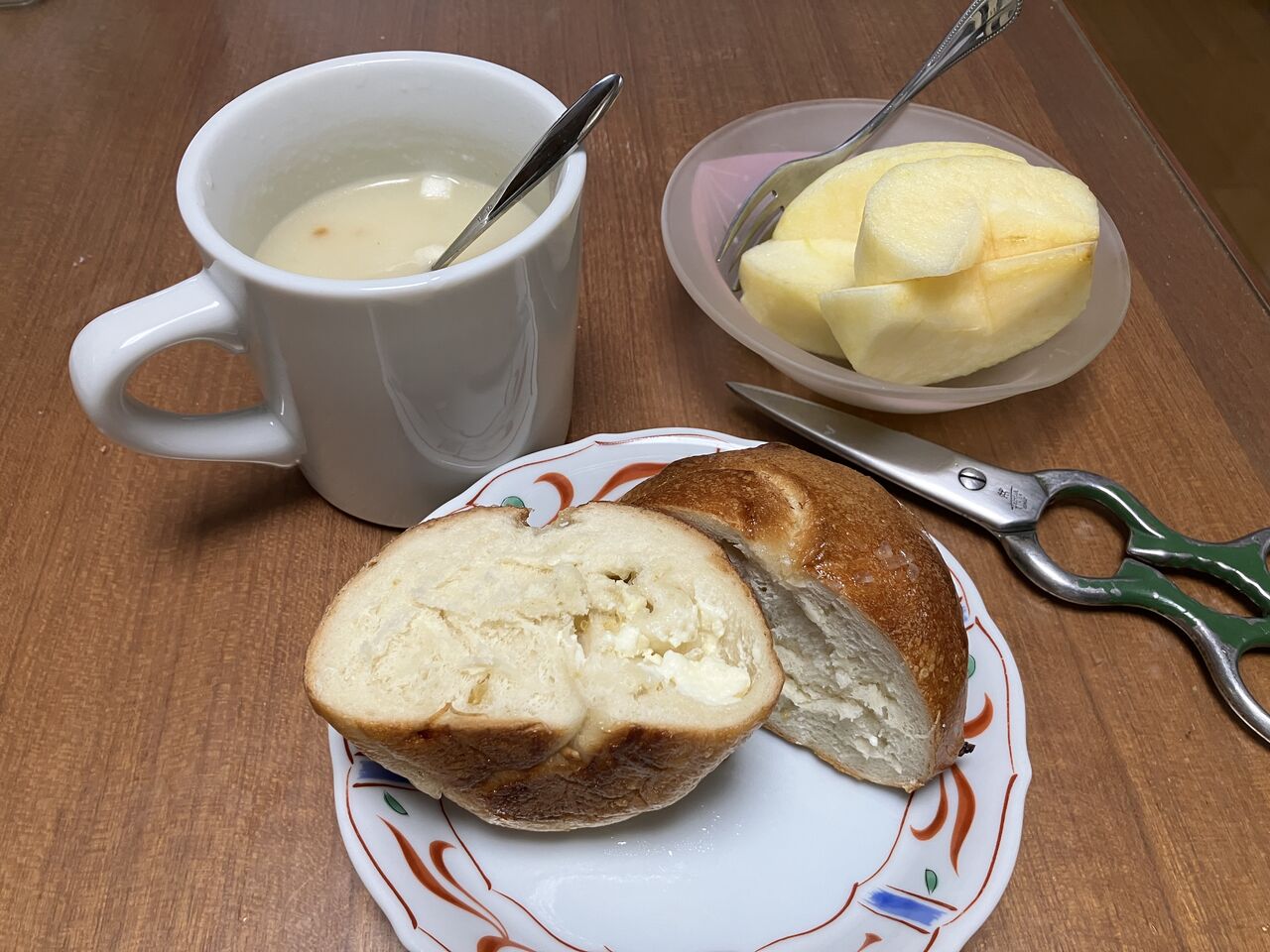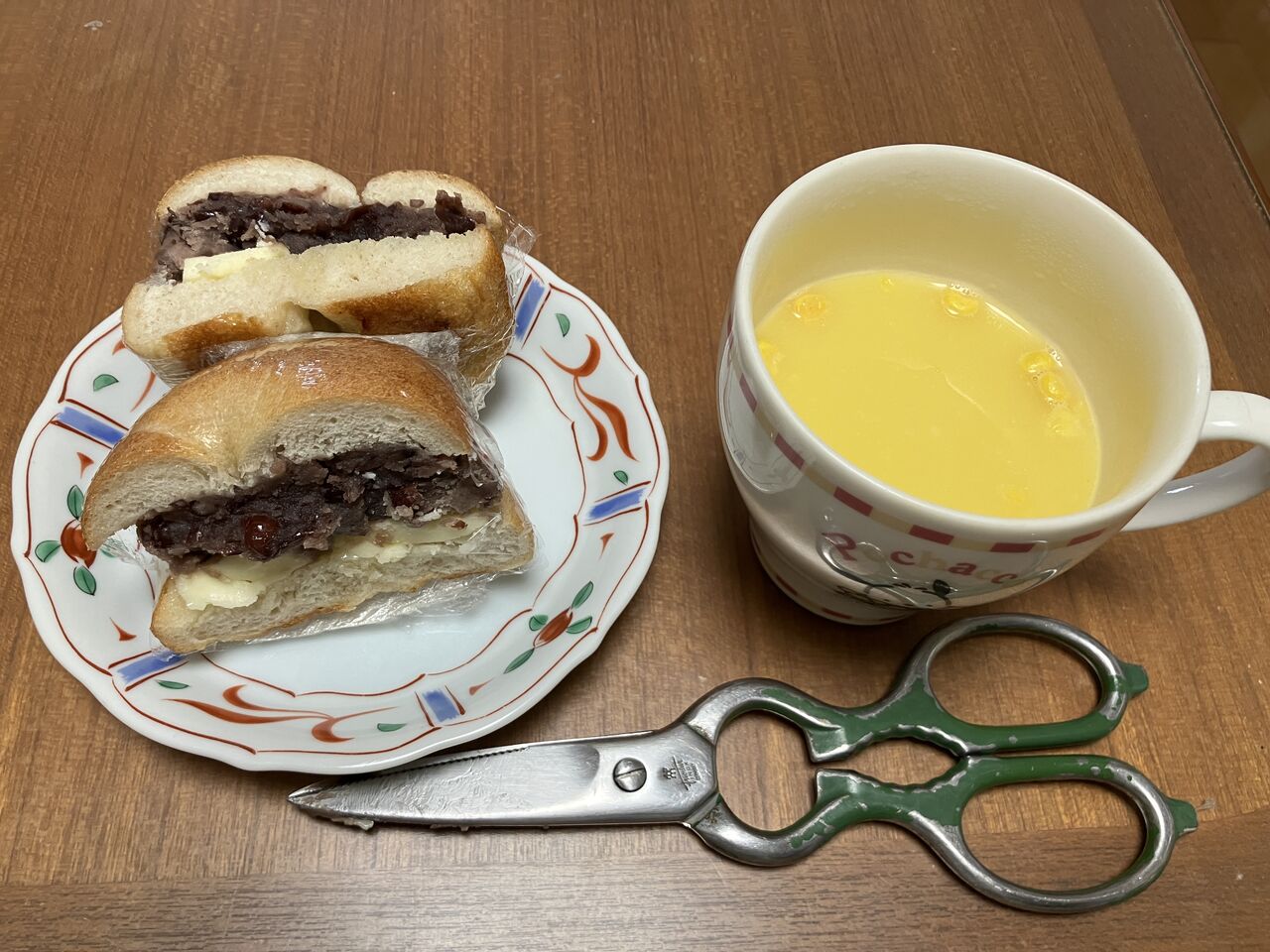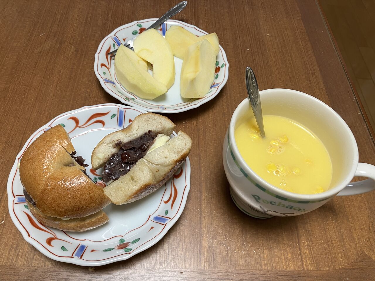 昼食、餡子バターベーグル、チンし過ぎでバターが溶けた、ポタージュスープ