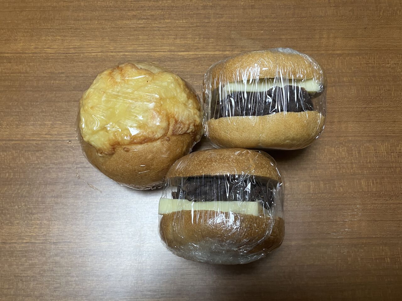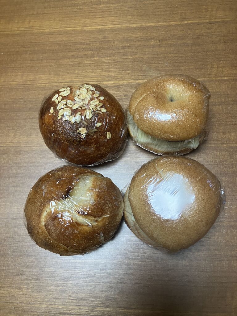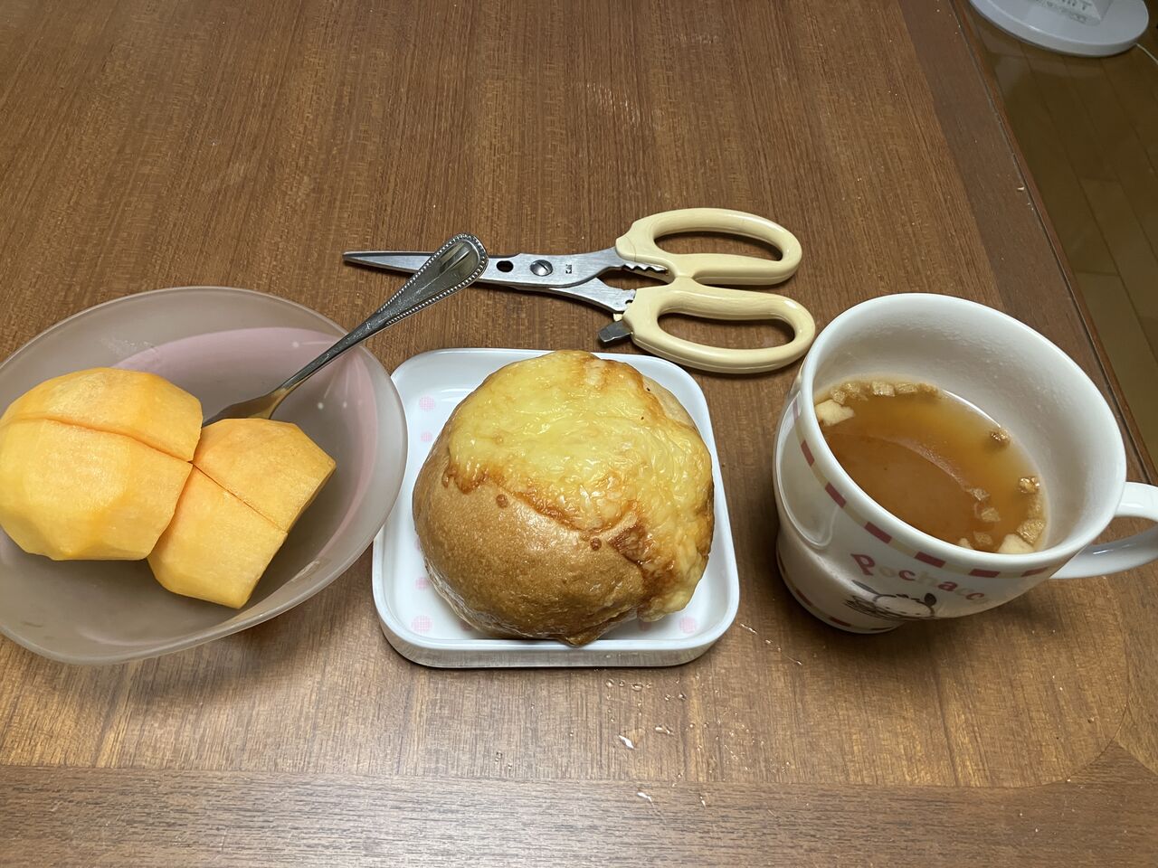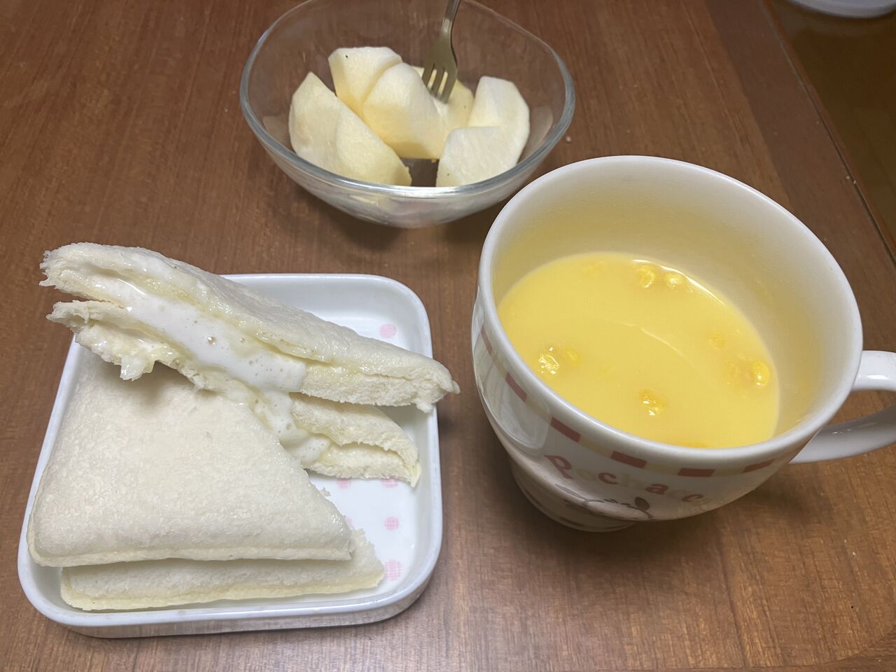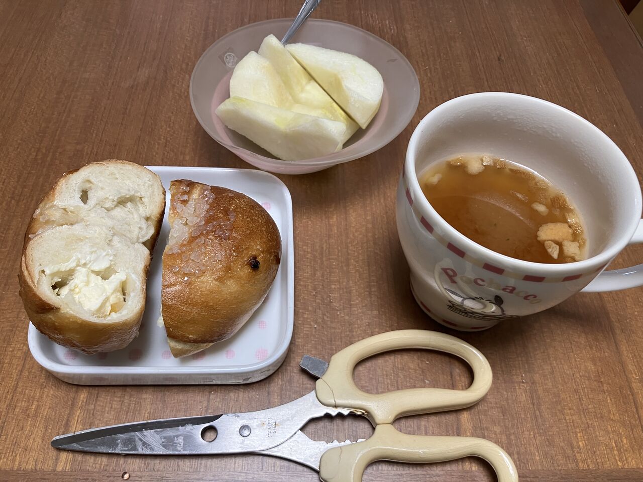 昼食、餡子バターベーグル、チンし過ぎでバターが溶けた、ポタージュスープ