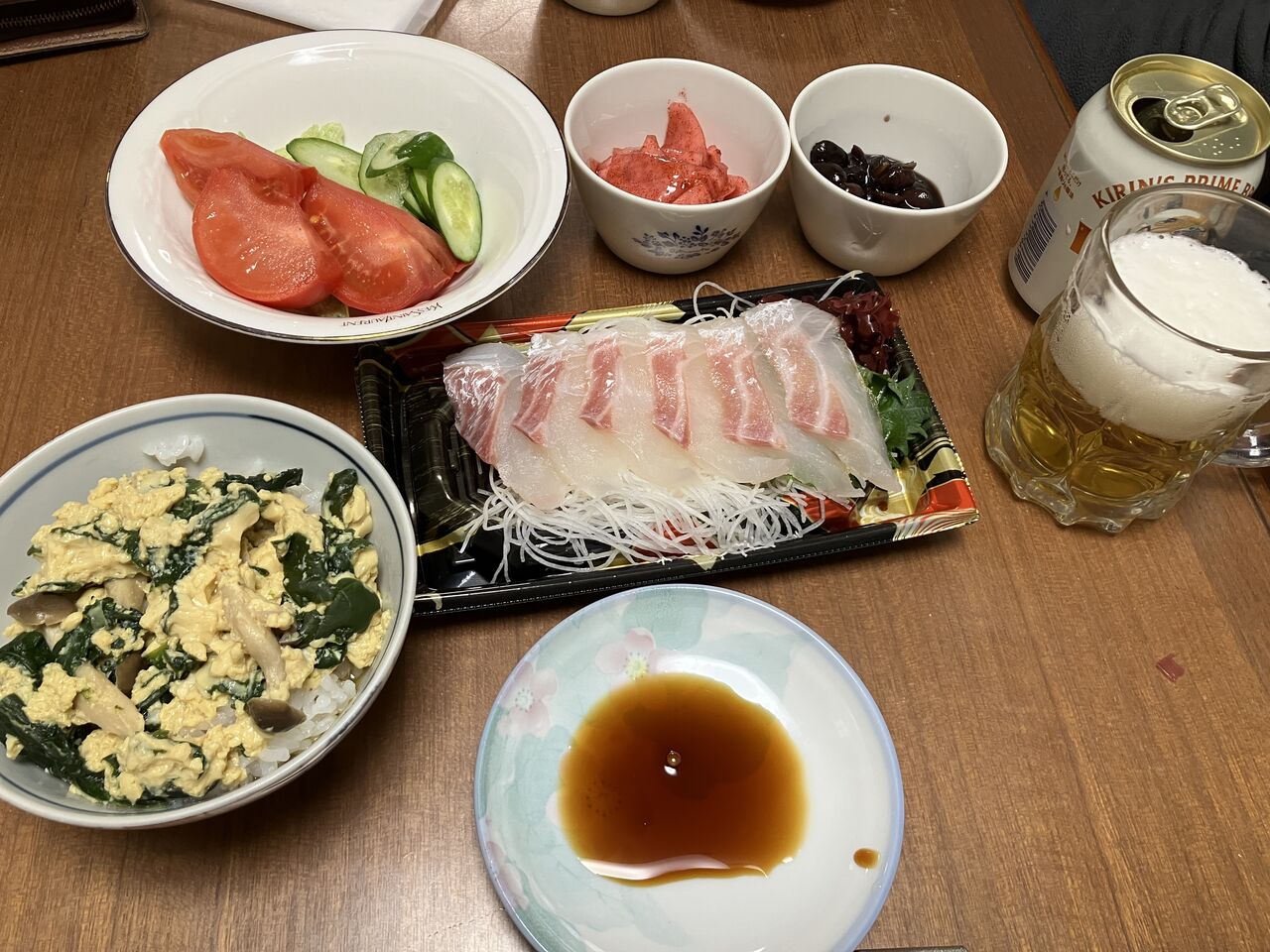 夕食、刺身、筍煮、ほうれん草のお浸し、ビール