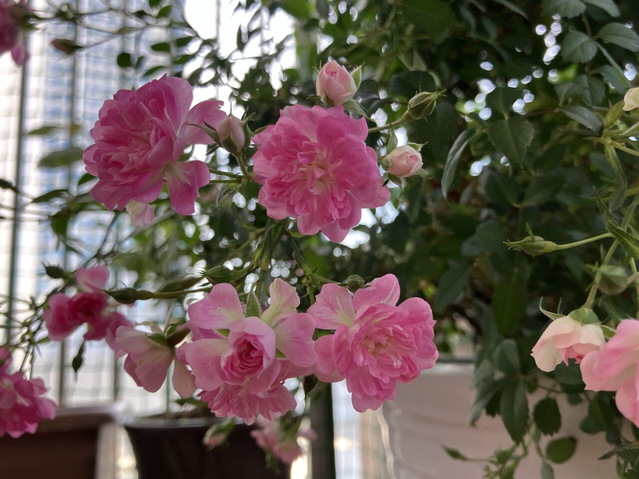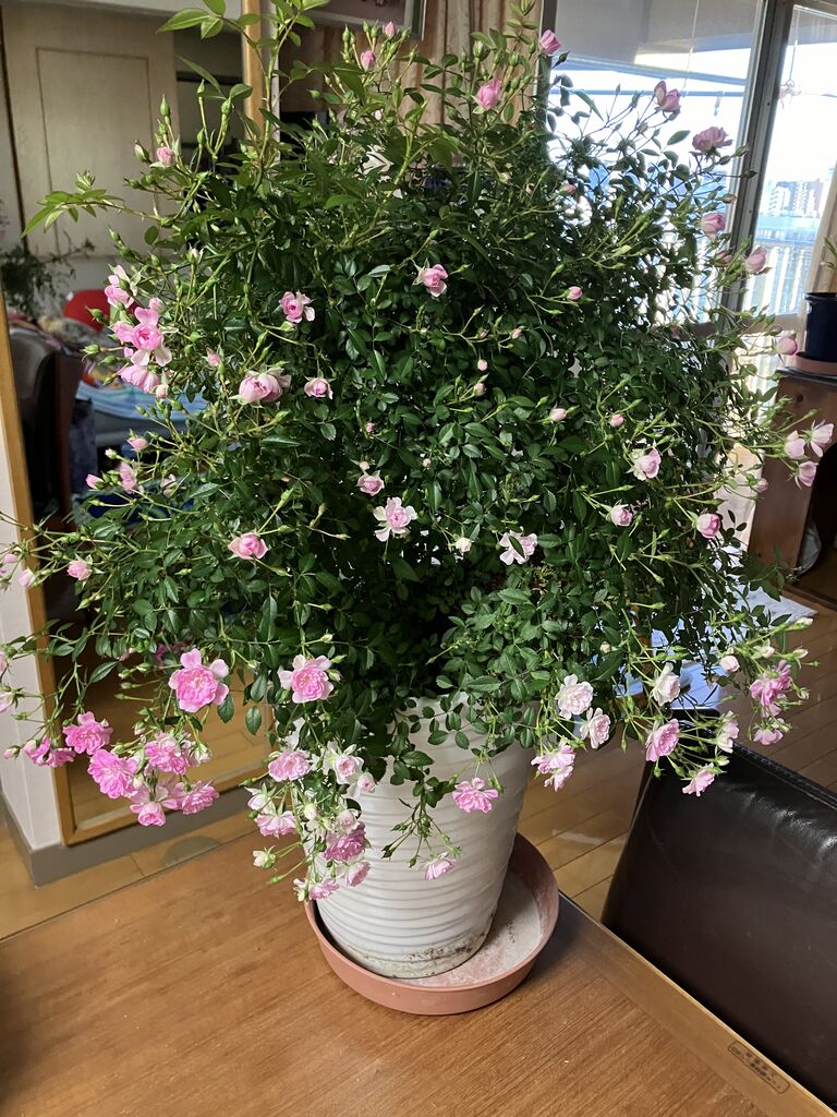 風が強かったので小バラの鉢を室内に取り込む、