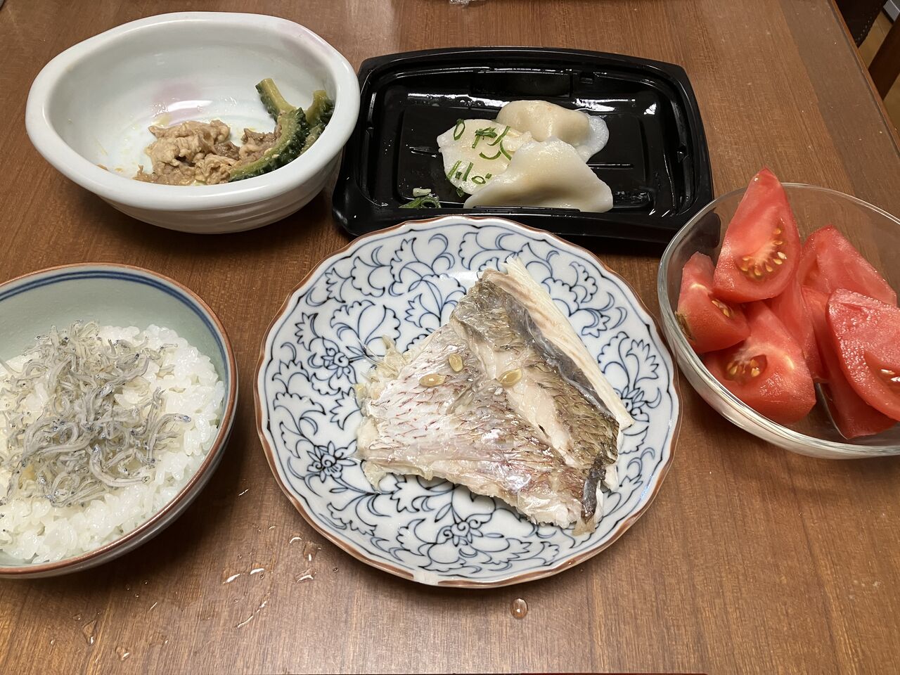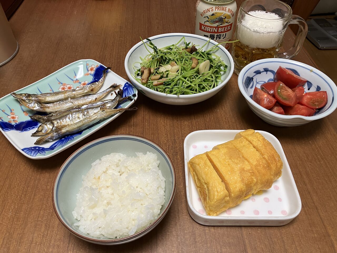 今夜の夕食 シシャモ(ショッパイ)店屋物の卵焼き、