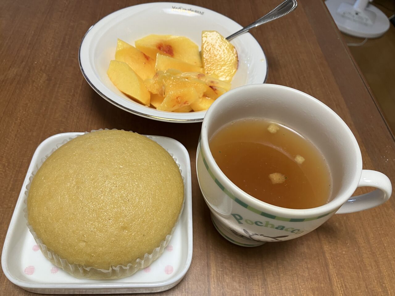 昼食、菓子パン、スープ、桃
