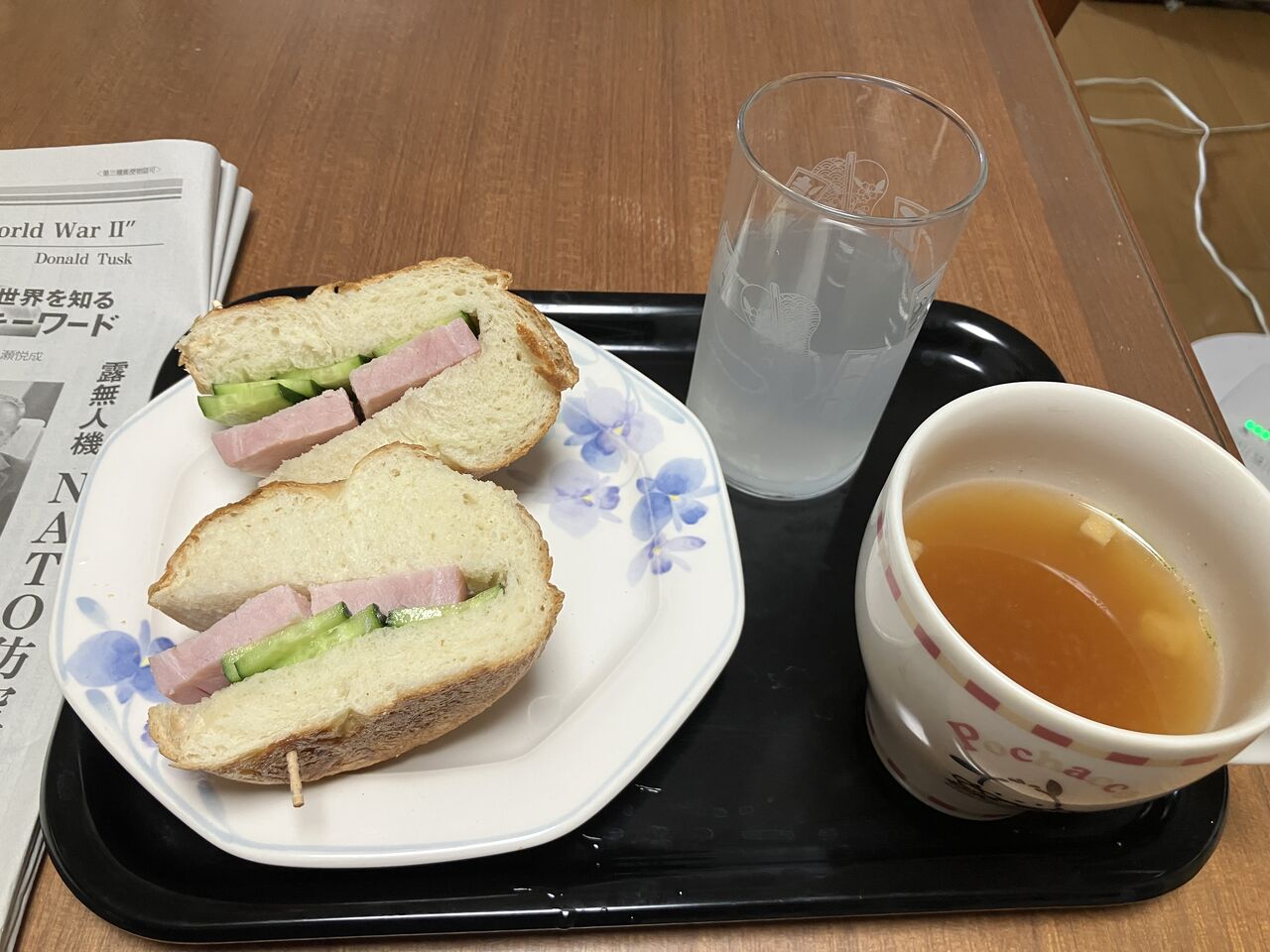 昼食、プレーンベーグルに厚切りハム、胡瓜を挟んで、スープ、アクエリアス