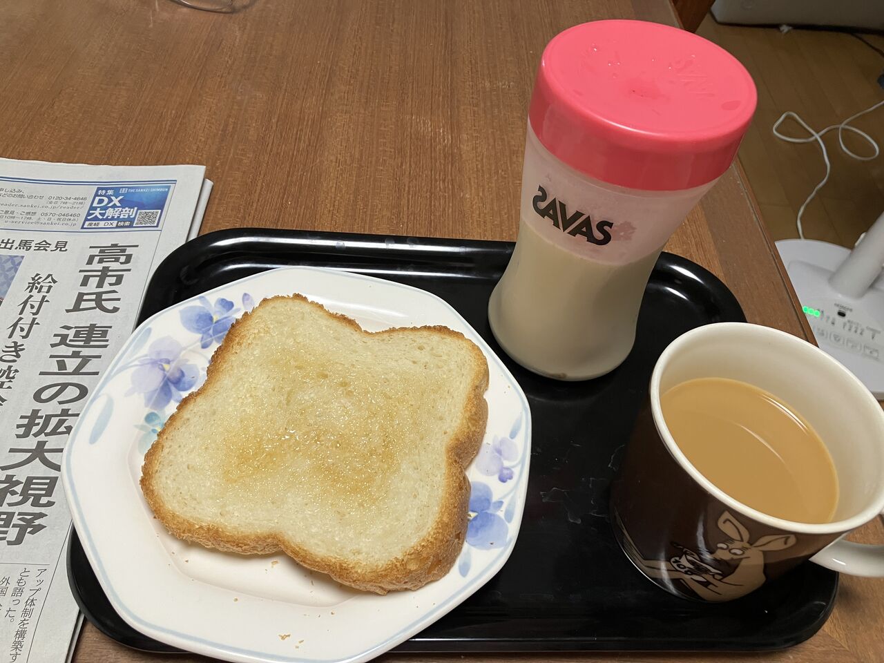 朝食、蜂蜜トースト、珈琲、牛乳、プロテイン