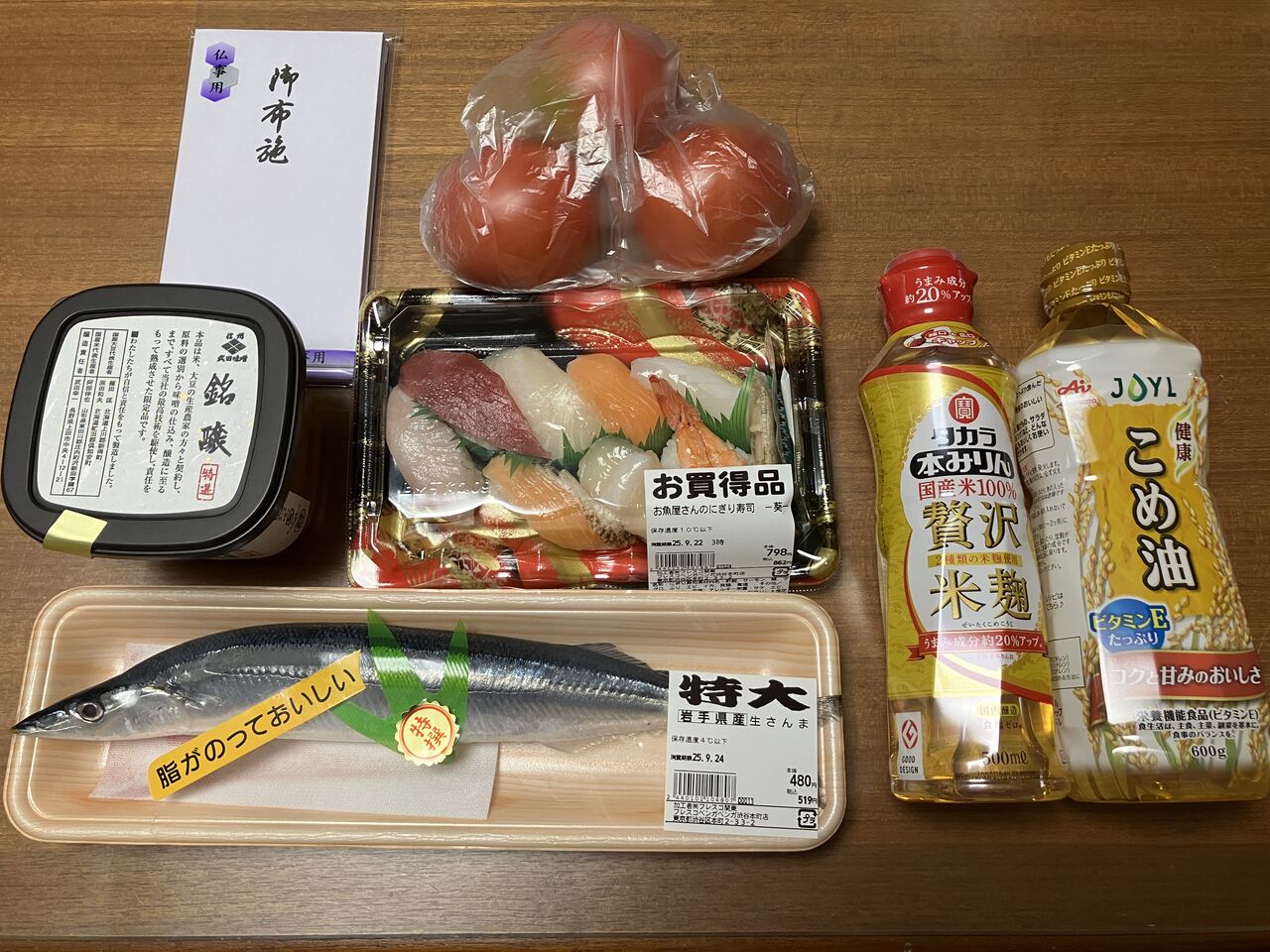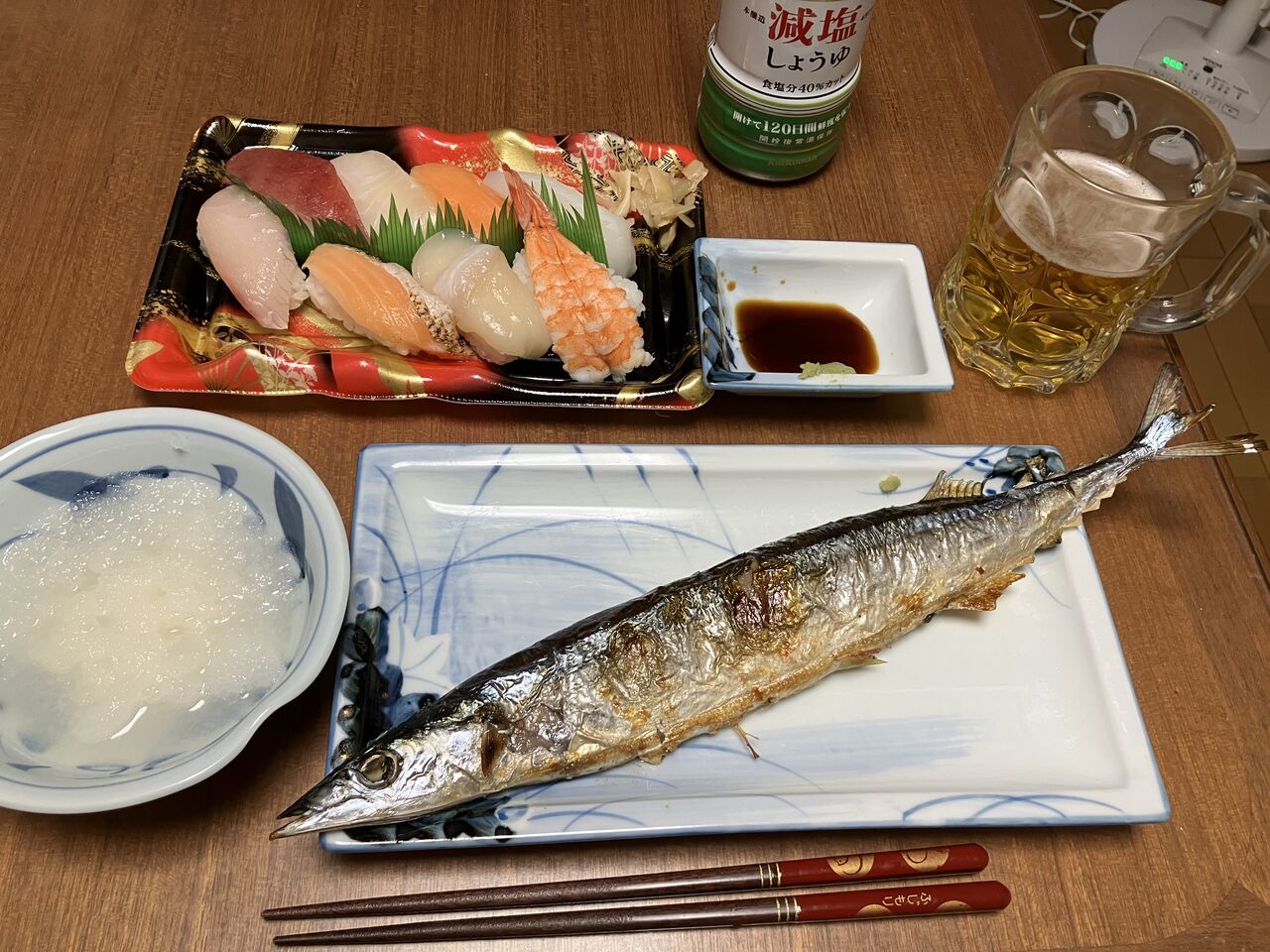 夕食、寿司と秋刀魚、大根おろし、ビール、