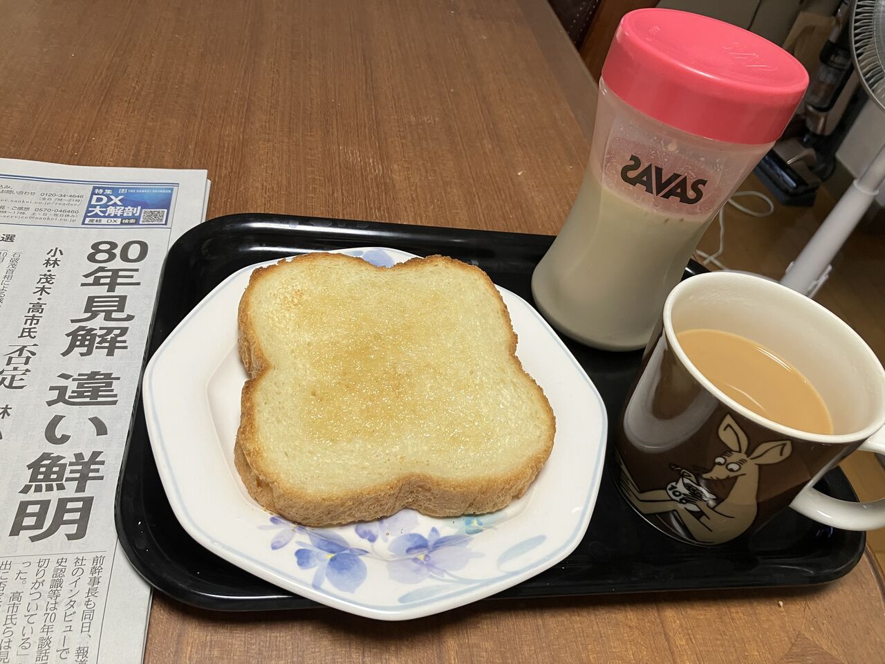 昼食、プレーンベーグルにトマト挟んで、スープ、アクエリアス