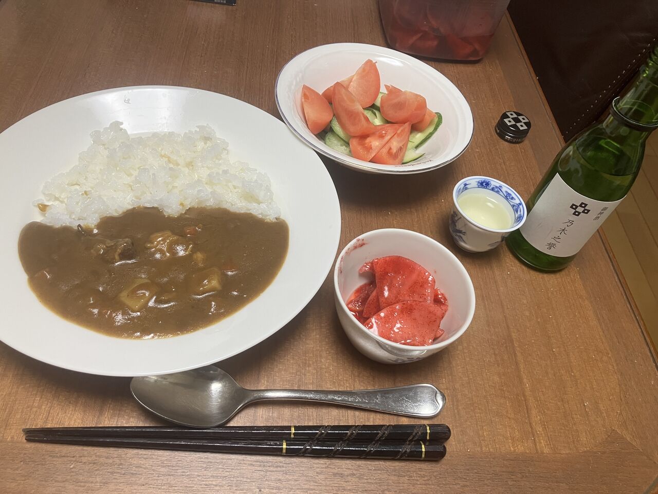 夕食、カレー(函館のカレー)サラダ、赤かぶ漬け、日本酒