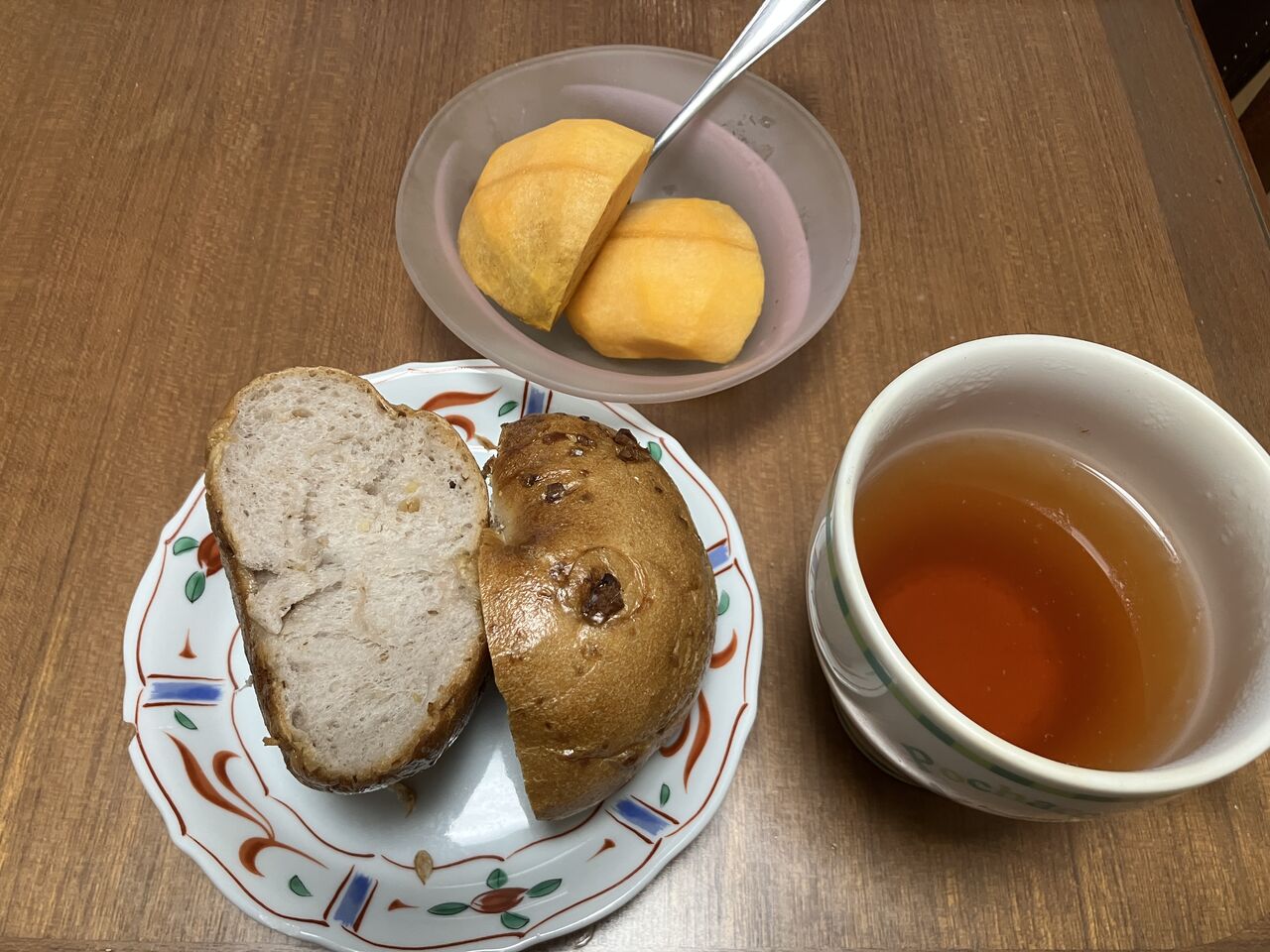 昼食、ベーグル(特徴のない内容)紅茶、柿