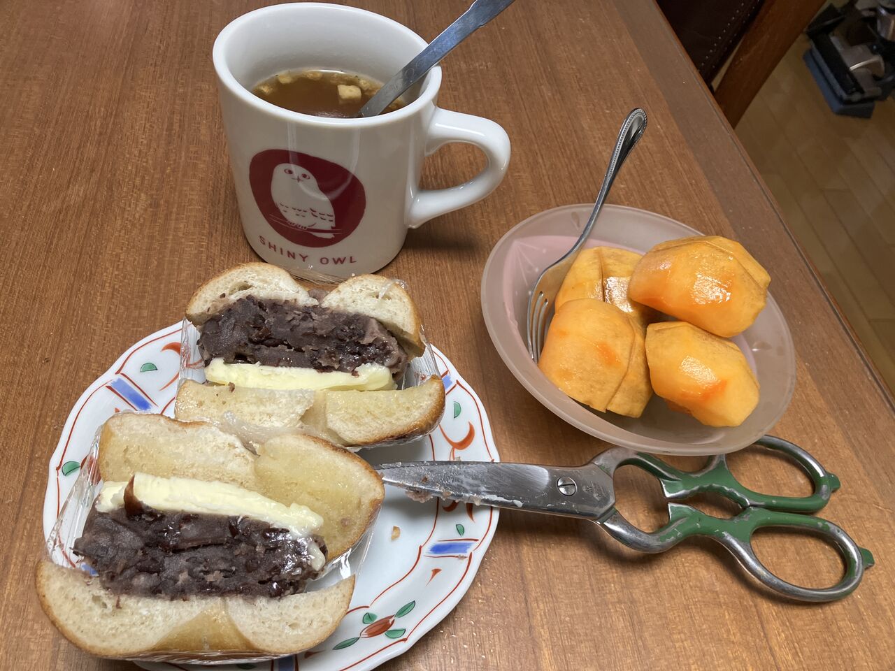 昼食、あんこバターベーグル、柿、スープ、この柿みしらず柿と言うらしいけど、