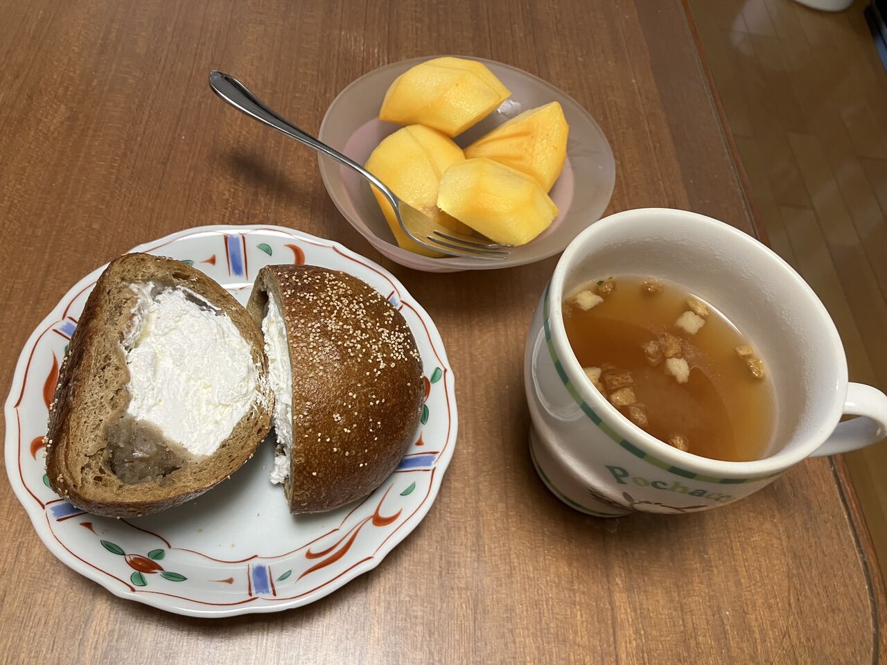 昼食、ベーグル(ホイップと芋餡みたいのが入っている)スープ、柿