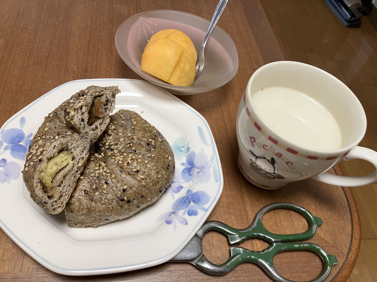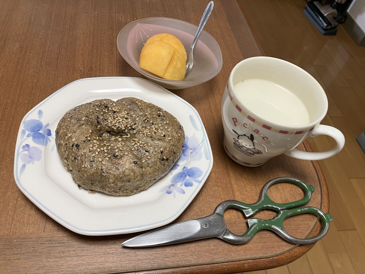 昼食、ベーグル、ポタージュスープ、柿