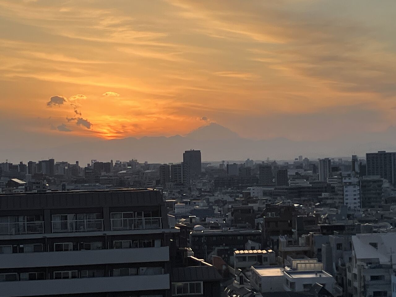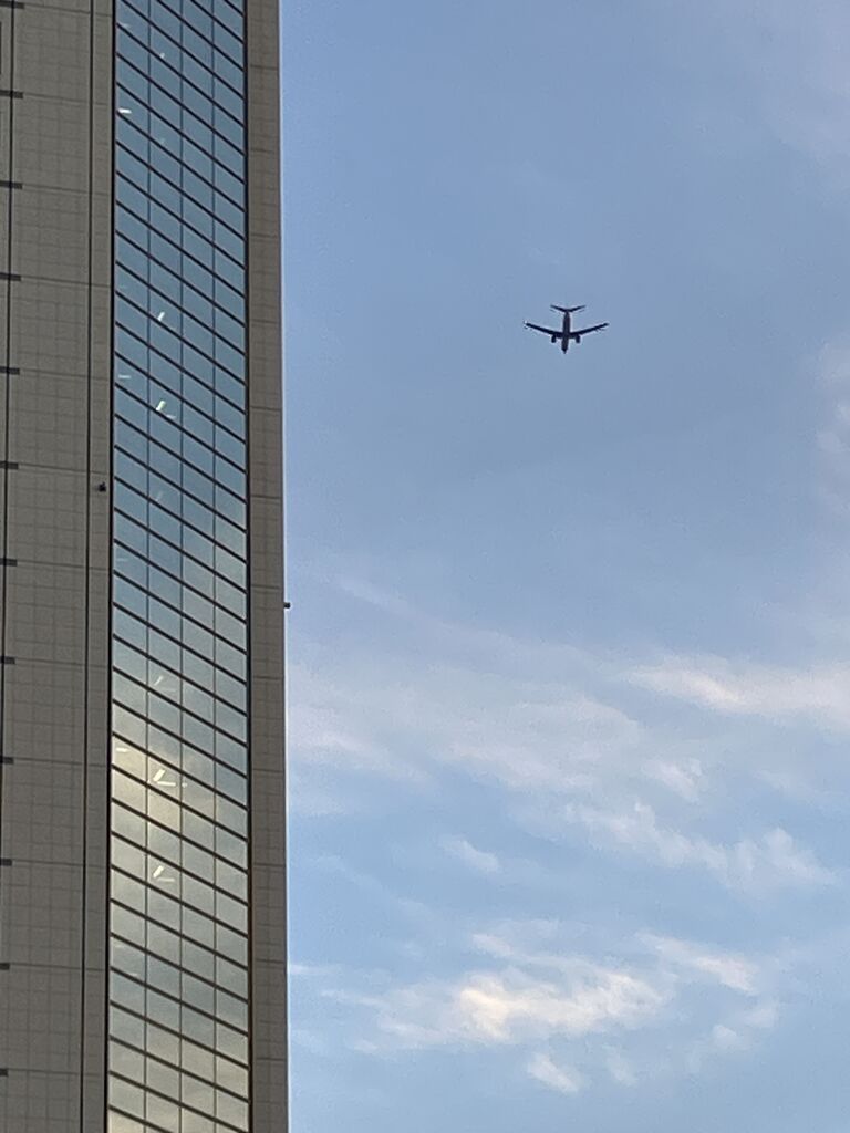 オペラシテイの横を飛ぶ飛行機、