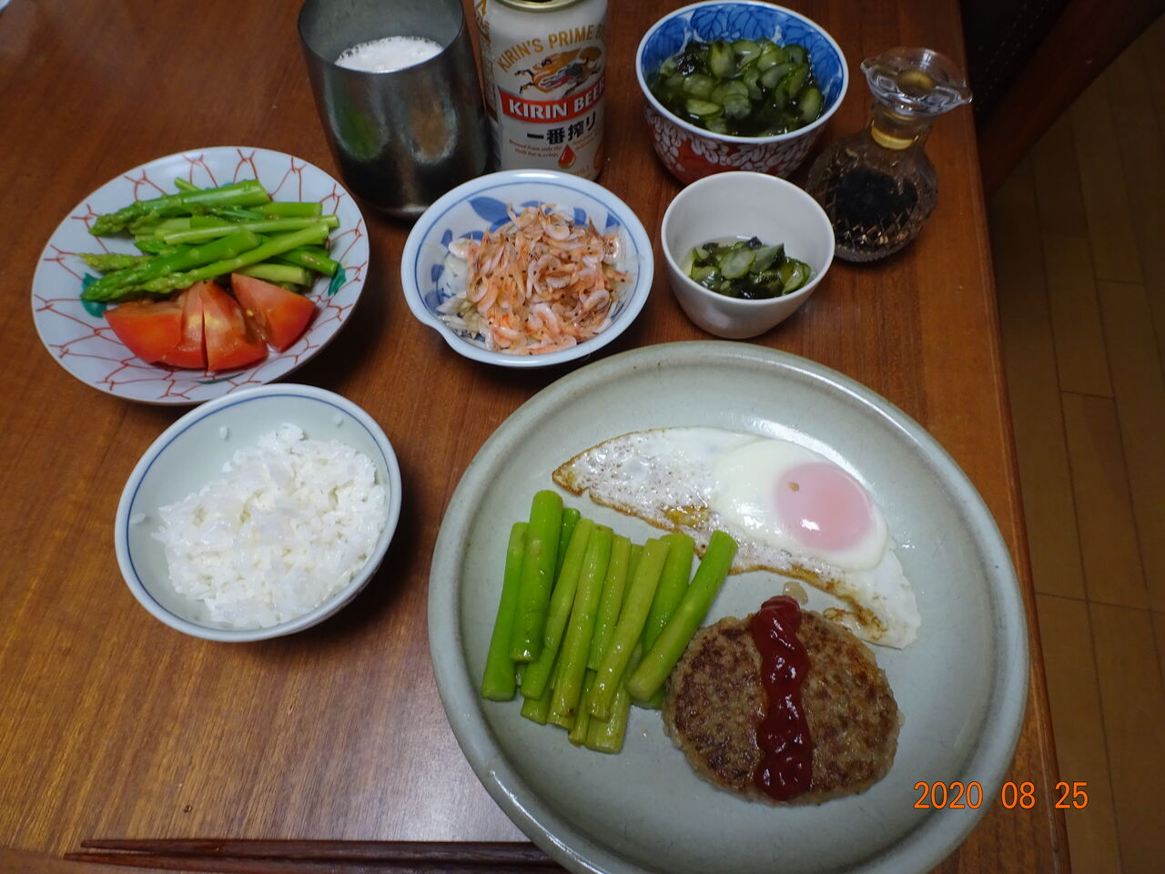 今夜の夕食 ハンバーグ、玉ねぎスライス桜エビ乗せ