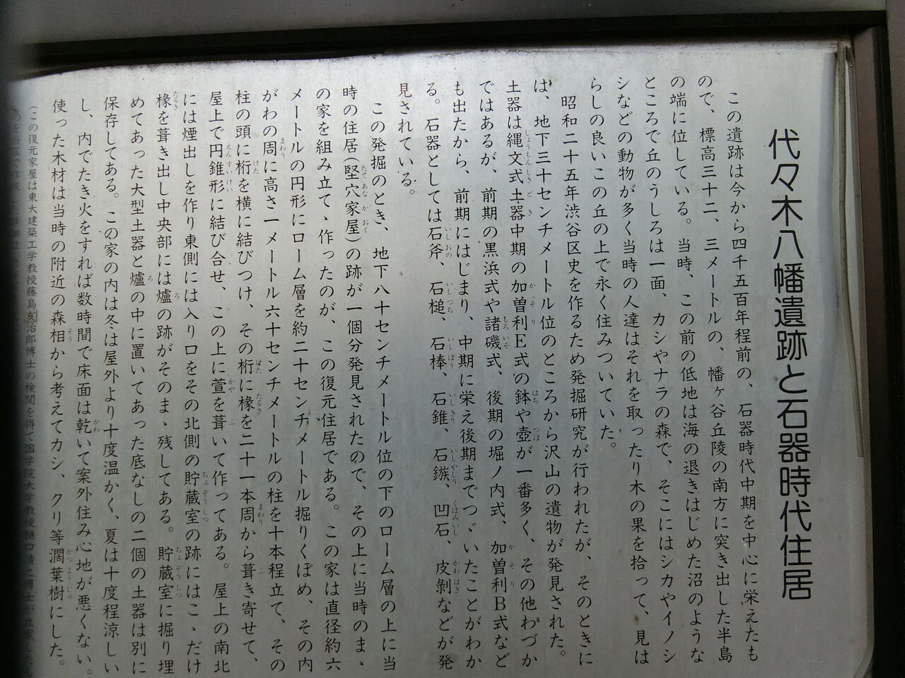 この発掘のとき、地下80cm位の下のローム層の上に当時の住居(竪穴家屋)の跡が一個分発見されたので、その上に当時のままの家を組み立てて作ったのが、この復元住居である。