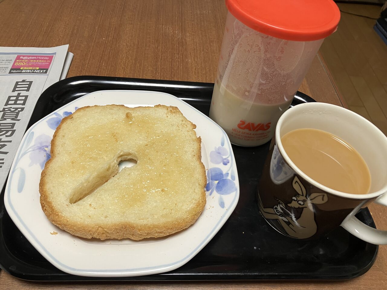朝食、蜂蜜トースト、珈琲、牛乳、プロテイン
