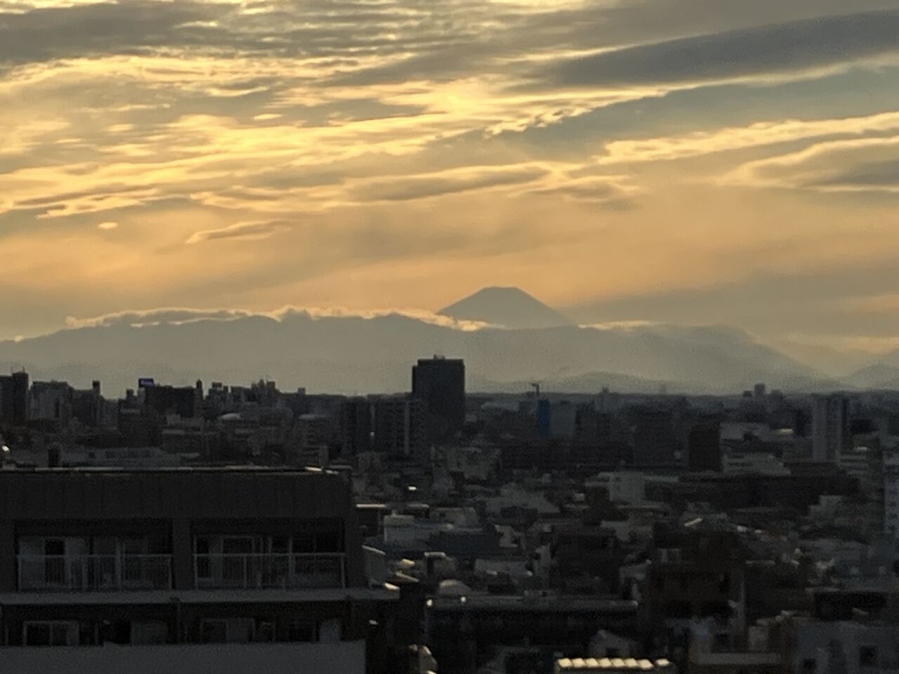 夕方散歩に行こうと支度したら西の空に富士山がおぼろに見えて
